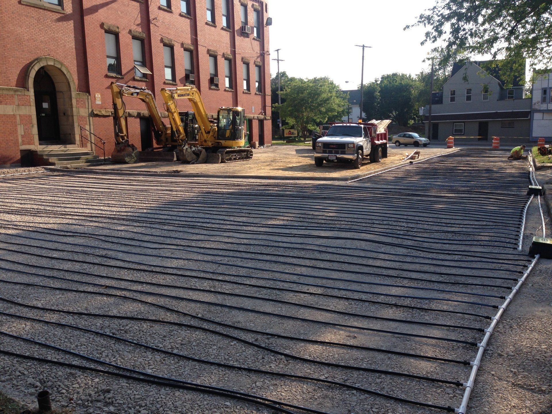 Traffic-bearing concrete rain cisterns installed under parking lot, Columbus, Ohio.